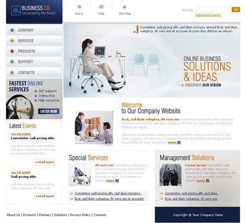 Шаблонные решения дизайна для web-сайтов.Описание:В наше время, говоря о шаблонных сайтах, мы нередко слышим, что такие веб сайты не живут дольше нескольких месяцев. Часто потенциальные клиенты, услышав слово «шаблонный», не хотят продолжать разговор с веб-студией в этом направление. Веб-cтудии, которые создают шаблонные продукты, часто лишены должного уважения в профессиональном сообществе. И, наконец, сайты дешевле 3 000 грн. часто считают не заслуживающими внимания. Вы тоже так думаете?...Да, шаблонные сайты действительно менее привлекательны, но это и есть альтернатива дорогим продуктам. Мы считаем, что не правильно лишать людей возможности этой альтернативы, хоть и не приветствуем веб-сайты такого уровня. Часто людям нужно просто дать информацию о себе или проект делается под промо-акцию (как презинтация в интернет), чтоб дать информацию о ней и все. Зачем тогда под такие задачи веб-сайт с индивидуальным дизайном и сложным функционалом, который обходится человеку в хорошую копеечку. Вспоминается сразу поговорка: На весь товар найдется свой покупатель! Не правда ли? Поэтому наша команда не исключила эту возможность, упростив это шаблонным веб-дизайном, но верстая это на собственную систему управления сайтом (CMS) с минимальным набором функционала (програмных модулей). Макет: «BUSINESS CO» Тематика: Бизнес