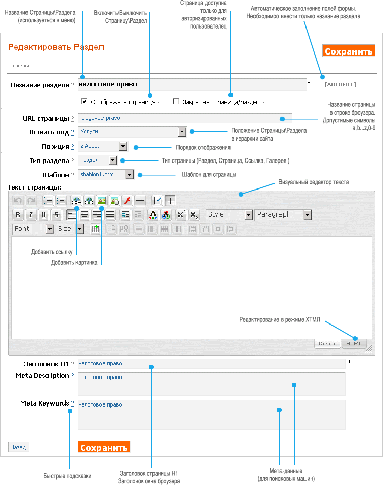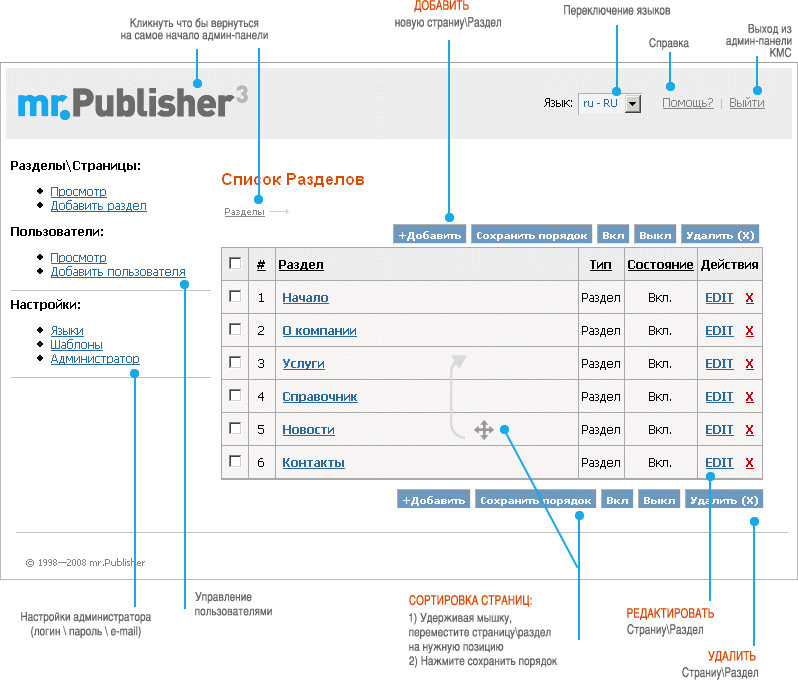 Вступление:Система управления сайтом Mr.Publisher работает по иерархическому принципу:- КАТЕГОРИЯ 1 *(1-й уровень меню) - ПодКатегория 1.1 *(2-й уровень меню) - Страница 1 *(3-й уровень меню) - Страница 2 - Страница 3 - ... - ПодКатегория 1.2 - ПодКатегория 1.3 - КАТЕГОРИЯ 2 - Страница 1 - Страница 2 - ... - КАТЕГОРИЯ 3 - ... - КАТЕГОРИЯ_N # CMS позволяет делать сложные иерархии (КАТЕГОРИЯ 1 -> ПодКатегория 1.1 -> ПодКатегория 1.1.1 -> Страницы (Товары)...) Но мы этого не рекомендуем, поскольку: 1) Пользователю потом сложно ориентироваться в навигации сайта. 2) Конечные страницы получаться с большим уровнем вложенности (4,5..) и тем самым менее значимыми для поисковых систем. 3) Приветствуется организация сайта в 2, максимум 3 уровня. # любую категорию можно перенести на другой уровень, менять порядок и т.д. # Используется 4 типа страниц: - Раздел (Для основных разделов сайта, Возможно создание подразделов - тогда отображается в меню сайта как ПодПункт) - Страница (Используется для новостей\статей (обычные текстовые страницы). Ссылка на страницу отображается в виде списка - Галерея (Для фотогалерей сайта) - Ссылка (Для перехода на внешние ресурсы, а также прямого перехода по внутренним разделам сайта) # CMS является SEO-оптимизированным, и рассчитан для простого и быстрого наполнения сайта информацией. Главные операции:
