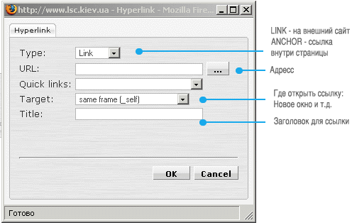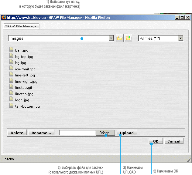 СОВЕТ1: СОВЕТ2: СОВЕТ3: СОВЕТ4: СОВЕТ5: Как вставить ссылку: СОВЕТ1: Как закачать файл\картику:![]() Если Вы закачивали картинку - она разместиться на странице. Так же Вы можете задать параметры для картинок (ширина, высота, отступы, выравнивание и т.д..) - кнопка Image. Если Вы закачивали файл - тогда Вы можете создать ссылку на него - кнопка Hyperlink. В URL: соответственно прописав http://www.ВАШ_ДОМЕН/ПАПКА/Название_файла СОВЕТ1: Рекомендуем использовать в названиях файлов\картинок только англ. маленькие буквы, цифры, тире (-), и нижнее подчеркивание. Будьте внимательны с русскими буквами (a,с,о,e,y,i,p,x) и пробелами в названиях. Приятной работы! |
