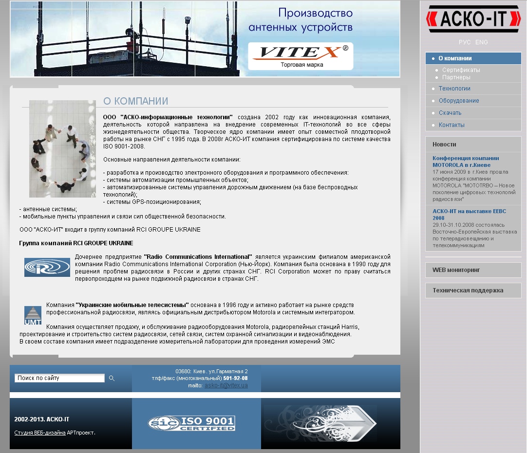 Описание сайта:ООО «АСКО-информационные технологии» создана 2002 году как инновационная компания, деятельность которой направлена на внедрение современных IT-технологий во все сферы жизнедеятельности общества. Творческое ядро компании имеет опыт совместной плодотворной работы на рынке СНГ с 1995 года. В 2008г АСКО-ИТ компания сертифицирована по системе качества ISO 9001-2008. Сделали:1. Индивидуальный Web- дизайн. 2. Верстка. 3. Программирование. 4. Реализация вспомогательных модулей. 5. Реализация построения иерархии разделов. 6. Поддержка сайта. |