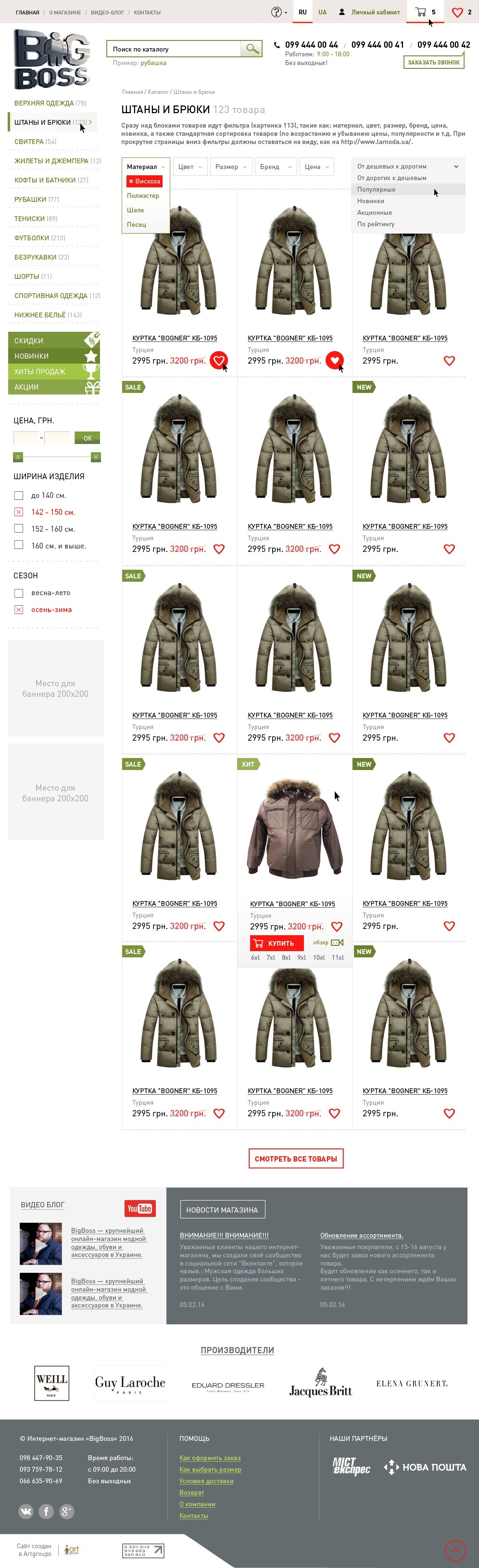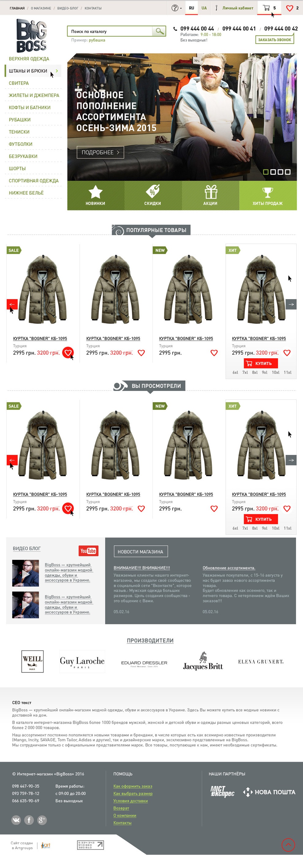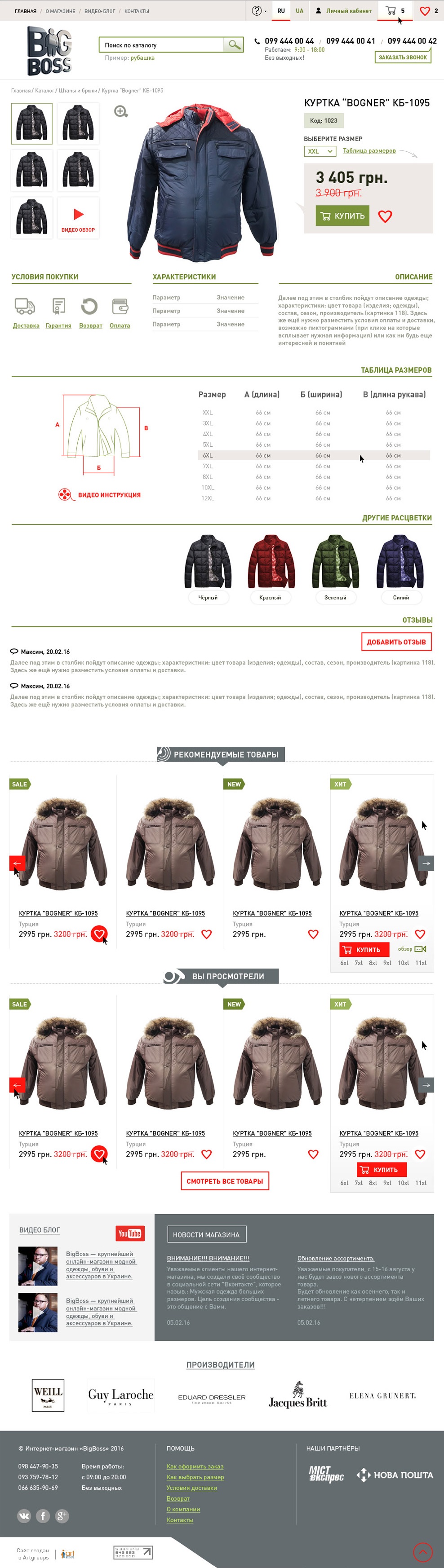 О проекте:Интернет-магазин «BigBoss» - это специализированный магазин одежды больших размеров для мужчин. Каждый мужчина, который имеет нестандартные габариты и порой затрудняется в выборе, подборе качественной мужской одежде больших размеров, с легкостью и удовольствием имеет возможность подобрать для себя интересующую одежду в интернет-магазине «BigBoss». При этом получает развернутое описание на этом ресурсе, а также подробную консультацию специалистов магазина, в точном подборе одежды под свои размеры не тратя свое дополнительное время, силы и нервы при заказе одежды. Рентабельность интернет-магазина в значительной мере зависит от функциональности и простоты использования Каталога товаров и его фильтров, потому что одежда больших размеров является одним из самых сложных составляющих при подборе гардероба любого мужчины. Актуальность информации о товарах + скорость обработки онлайн заказа помогают данному проекту завоевывать лояльность и любовь покупателей, а также занимать свою нишу среди крупнейших продавцов одежды больших размеров в Украине. Интернет-магазин осуществляет доставку заказанных Вами товаров по всей территории Украины. В Интернет-магазине действует гибкая система скидок. Также одними из принципов работы интернет-магазина «BigBoss» - является оперативность и стремление максимально удовлетворить потребности своих клиентов.