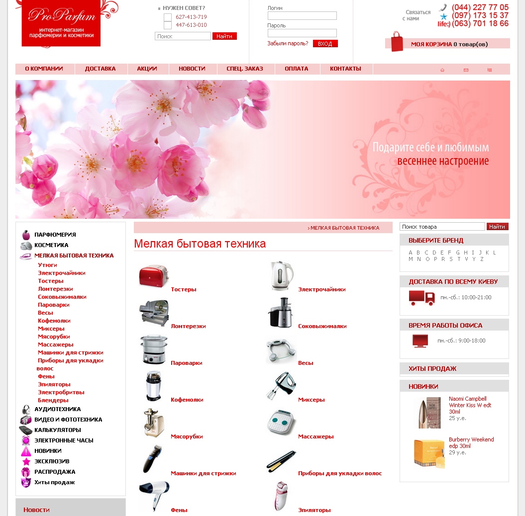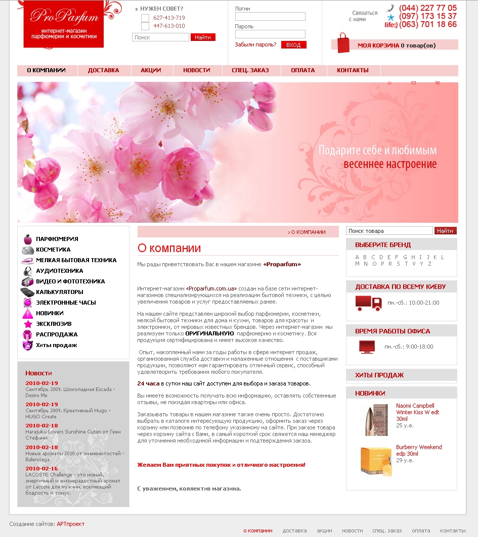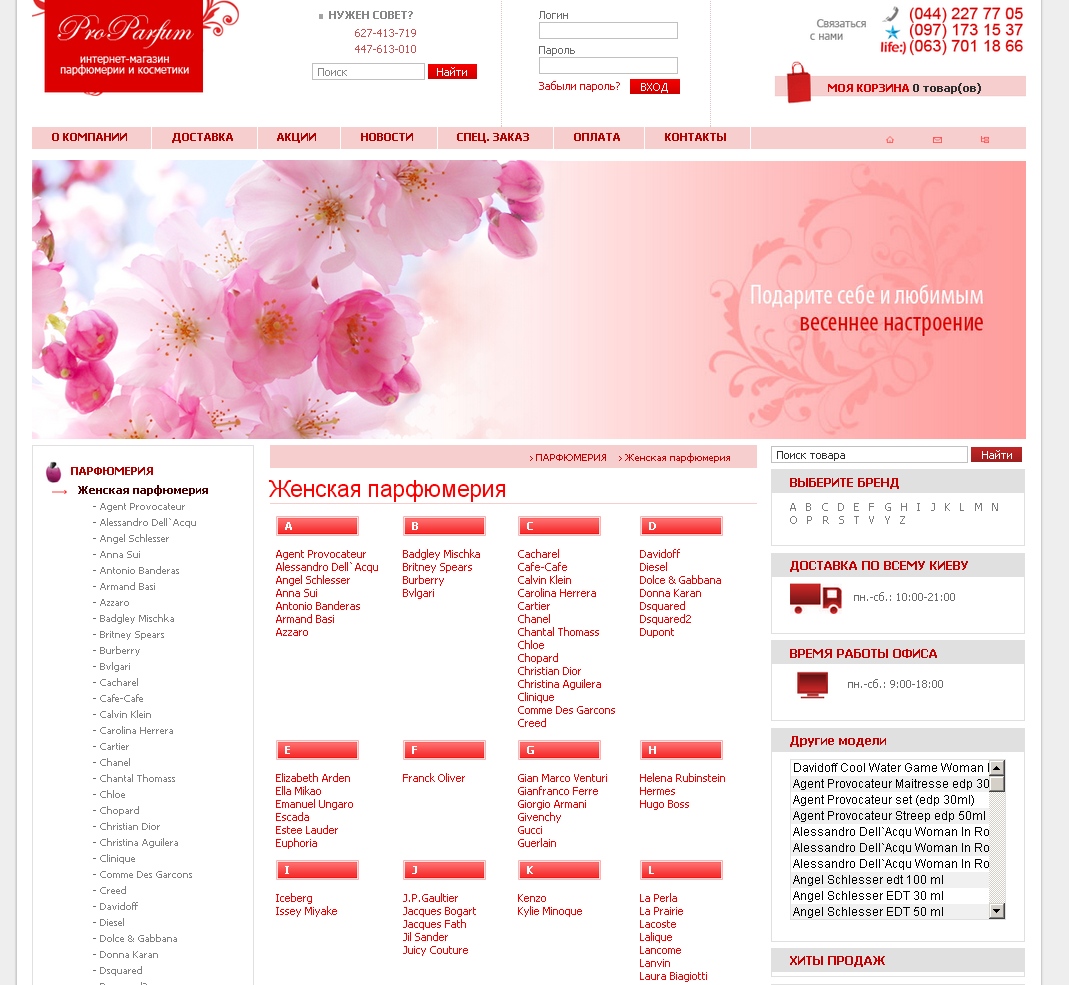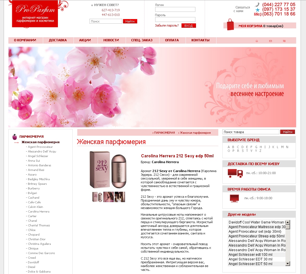 Описание сайта:Мы рады приветствовать Вас, в нашем интернет магазине оригинальной парфюмерии и косметики «ProParfum».На нашем сайте представлен широкий выбор парфюмерии, косметики, мелкой бытовой техники для дома и кухни, товаров для красоты и электроники, от известных мировых брендов. Через интернет-магазин мы реализуем только ОРИГИНАЛЬНУЮ парфюмерию и косметику. Вся продукция сертифицирована и имеет высокое качество. Опыт, накопленный нами за годы работы в сфере интернет продаж, организованная служба доставки и налаженные отношения с поставщиками продукции, позволяют нам гарантировать отличный сервис, способный удовлетворить требования любого покупателя. 24 часа в сутки наш сайт доступен для выбора и заказа оригинальных товаров. Сделали:1. Индивидуальный Web- дизайн. 2. Верстка. 3. Программирование. 4. Реализация вспомогательных модулей. 5. Реализация построения иерархии товаров. 6. Реализация фильтров по параметрам. 7. Продвижение сайта в поисковиках. 8. Контекстная реклама |