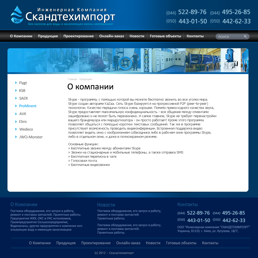 Описание сайта:Инженерная Компания «СкандТехИмпорт» была создана в 2003 году как общество с ограниченной ответственностью. На рынке Украины уже 9 лет безупречной работы.