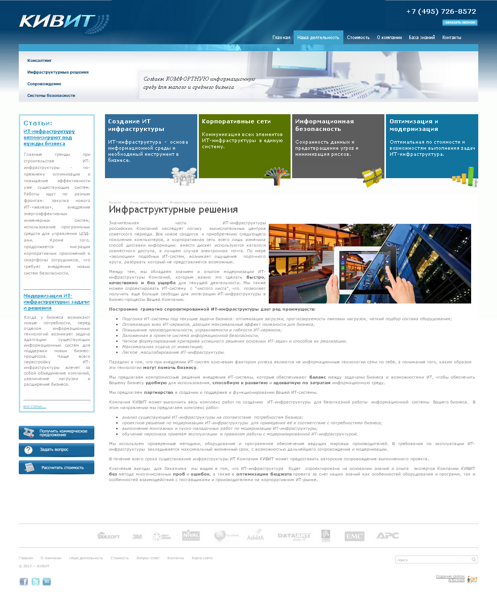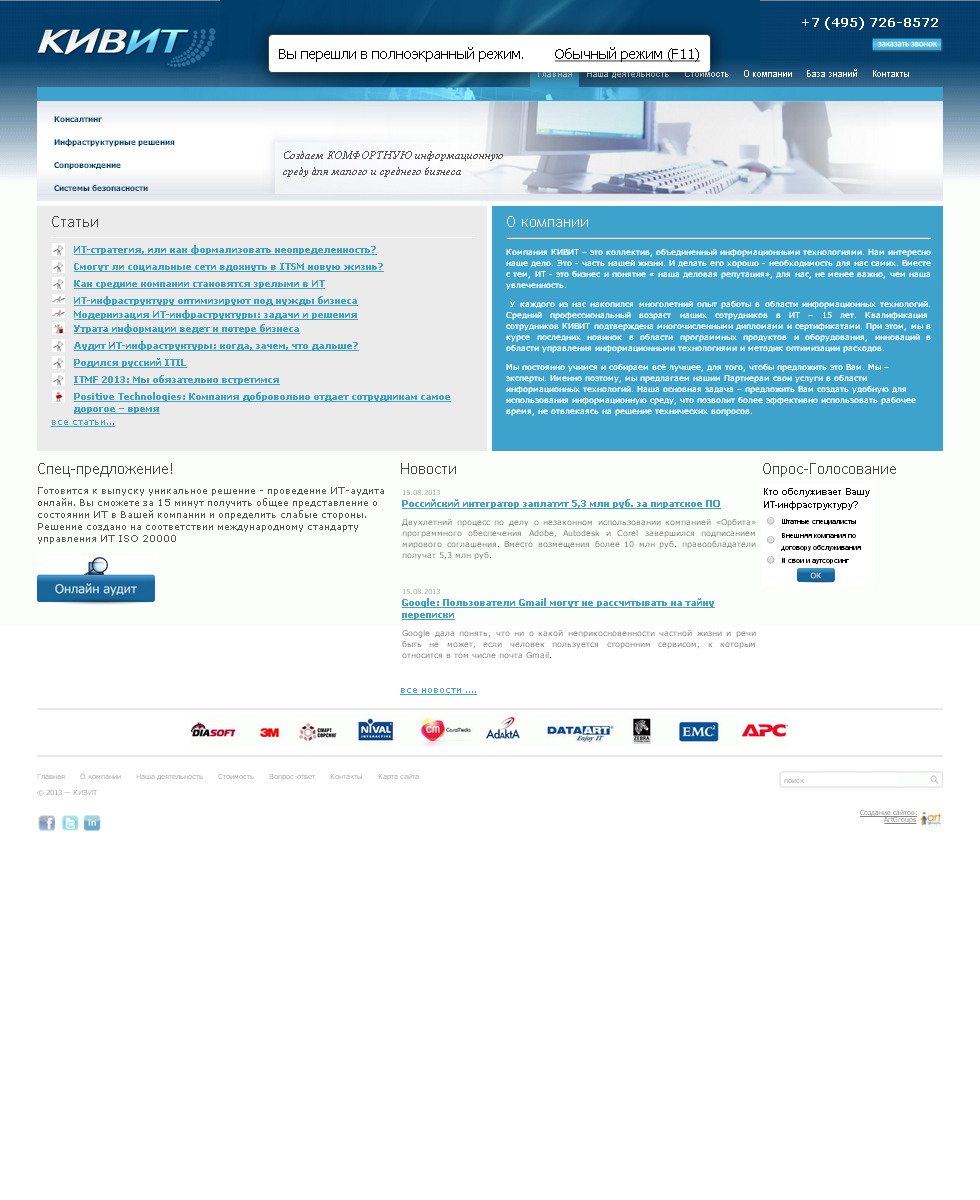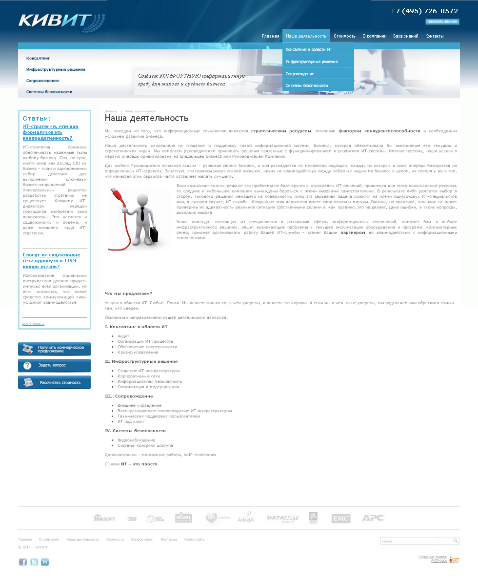 Описание сайта:Компания «КИВИТ» – это коллектив, объединенный многолетней работой в сфере информационных технологий. Нам интересно наше дело. Это - часть нашей жизни. И делать его хорошо - необходимость для нас самих. Вместе с тем, ИТ - это бизнес, и понятие «наша деловая репутация» для нас не менее важно, чем наша увлеченность.
