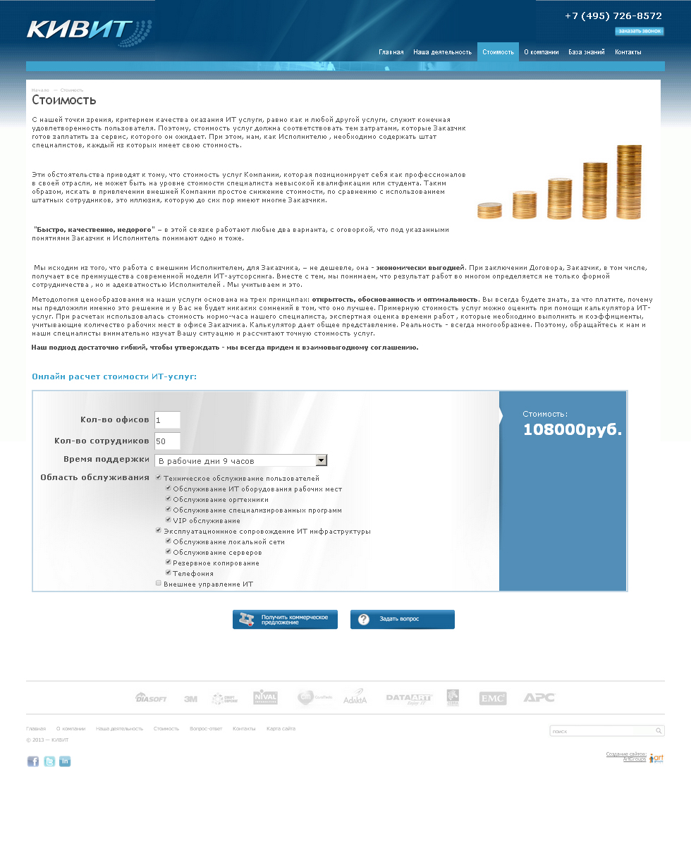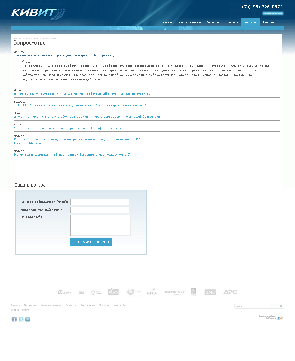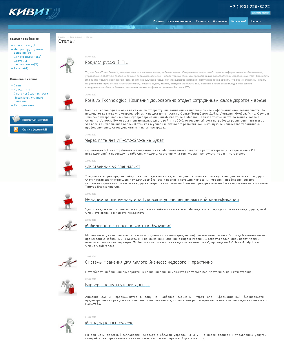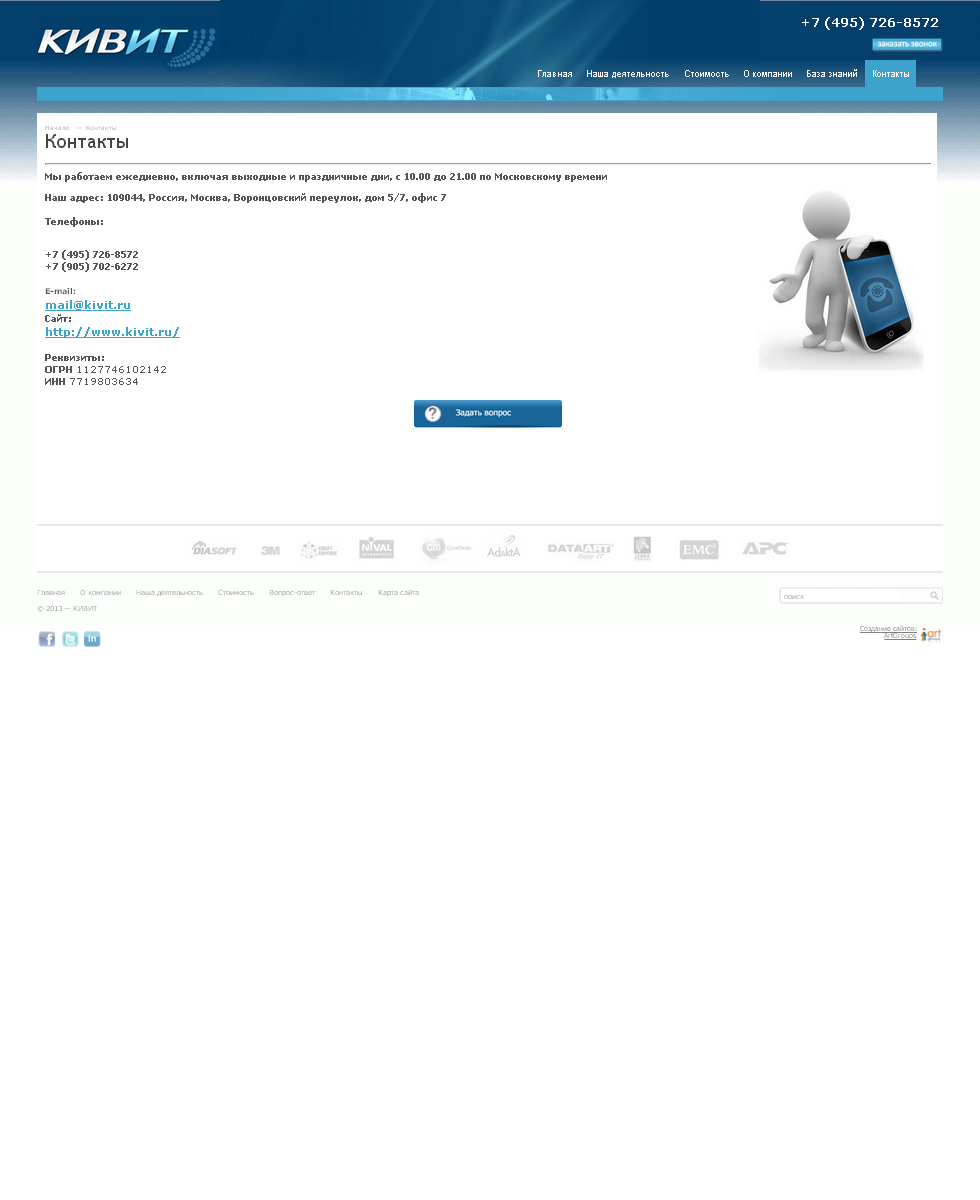 Описание сайта:Компания «КИВИТ» – это коллектив, объединенный многолетней работой в сфере информационных технологий. Нам интересно наше дело. Это - часть нашей жизни. И делать его хорошо - необходимость для нас самих. Вместе с тем, ИТ - это бизнес, и понятие «наша деловая репутация» для нас не менее важно, чем наша увлеченность.