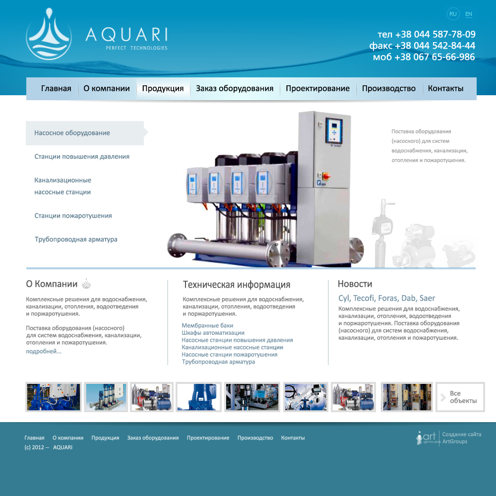 Описание сайта:«Аквари» - стремительно развивающаяся компания, основным направлением деятельности которой, является производство насосных станций (водоснабжения, пожаротушения), так же комплексные поставки насосного энергосберегающего оборудования европейского производства для промышленного, строительного, жилищно-коммунального и энергетического сектора Украины.