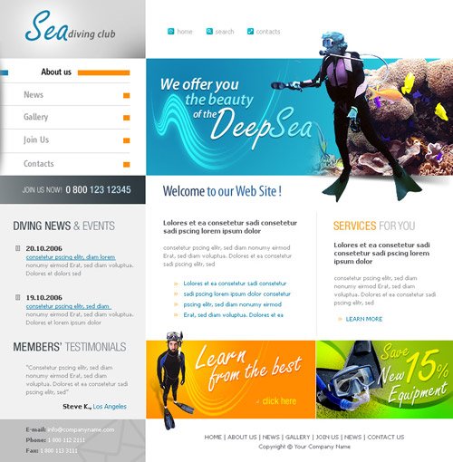 Шаблонные решения дизайна для web-сайтов.Описание:В наше время, говоря о шаблонных сайтах, мы нередко слышим, что такие веб сайты не живут дольше нескольких месяцев. Часто потенциальные клиенты, услышав слово «шаблонный», не хотят продолжать разговор с веб-студией в этом направление. Веб-cтудии, которые создают шаблонные продукты, часто лишены должного уважения в профессиональном сообществе. И, наконец, сайты дешевле 3 000 грн. часто считают не заслуживающими внимания. Вы тоже так думаете?...Да, шаблонные сайты действительно менее привлекательны, но это и есть альтернатива дорогим продуктам. Мы считаем, что не правильно лишать людей возможности этой альтернативы, хоть и не приветствуем веб-сайты такого уровня. Часто людям нужно просто дать информацию о себе или проект делается под промо-акцию (как презинтация в интернет), чтоб дать информацию о ней и все. Зачем тогда под такие задачи веб-сайт с индивидуальным дизайном и сложным функционалом, который обходится человеку в хорошую копеечку. Вспоминается сразу поговорка: На весь товар найдется свой покупатель! Не правда ли? Поэтому наша команда не исключила эту возможность, упростив это шаблонным веб-дизайном, но верстая это на собственную систему управления сайтом (CMS) с минимальным набором функционала (програмных модулей). Макет: «Sea-Diving-Club» Тематика: Спорт