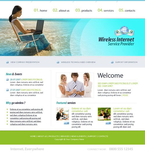 Шаблонные решения дизайна для web-сайтов.Описание:В наше время, говоря о шаблонных сайтах, мы нередко слышим, что такие веб сайты не живут дольше нескольких месяцев. Часто потенциальные клиенты, услышав слово «шаблонный», не хотят продолжать разговор с веб-студией в этом направление. Веб-cтудии, которые создают шаблонные продукты, часто лишены должного уважения в профессиональном сообществе. И, наконец, сайты дешевле 3 000 грн. часто считают не заслуживающими внимания. Вы тоже так думаете?...Да, шаблонные сайты действительно менее привлекательны, но это и есть альтернатива дорогим продуктам. Мы считаем, что не правильно лишать людей возможности этой альтернативы, хоть и не приветствуем веб-сайты такого уровня. Часто людям нужно просто дать информацию о себе или проект делается под промо-акцию (как презинтация в интернет), чтоб дать информацию о ней и все. Зачем тогда под такие задачи веб-сайт с индивидуальным дизайном и сложным функционалом, который обходится человеку в хорошую копеечку. Вспоминается сразу поговорка: На весь товар найдется свой покупатель! Не правда ли? Поэтому наша команда не исключила эту возможность, упростив это шаблонным веб-дизайном, но верстая это на собственную систему управления сайтом (CMS) с минимальным набором функционала (програмных модулей). Макет: «Wireless Internet» Тематика: HI-TECH